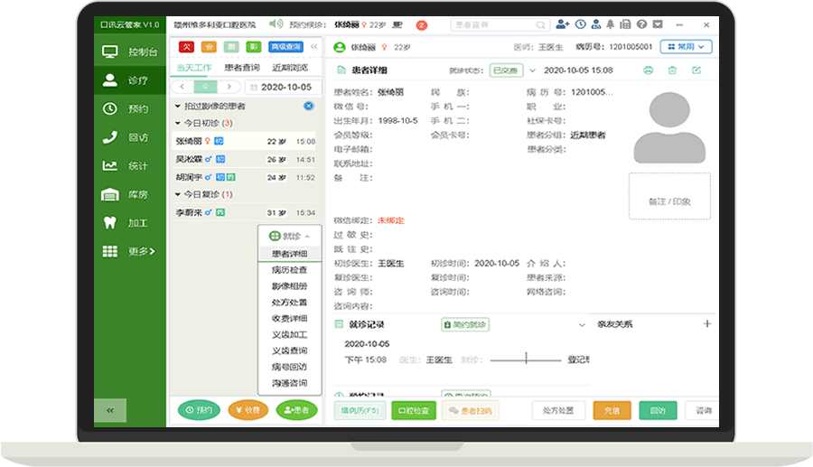 快捷导航、预约诊疗、义齿加工、回访、电子病历等栏目,全方位管理您的门诊